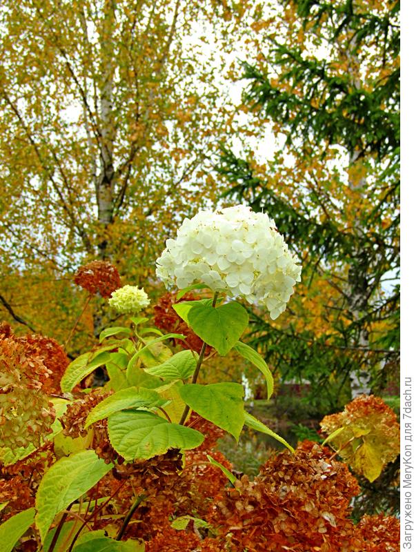 Гортензии, которые тоже ещё неделю назад гордо демонстрировали свои шикарные кисти, стоят все коричневые.