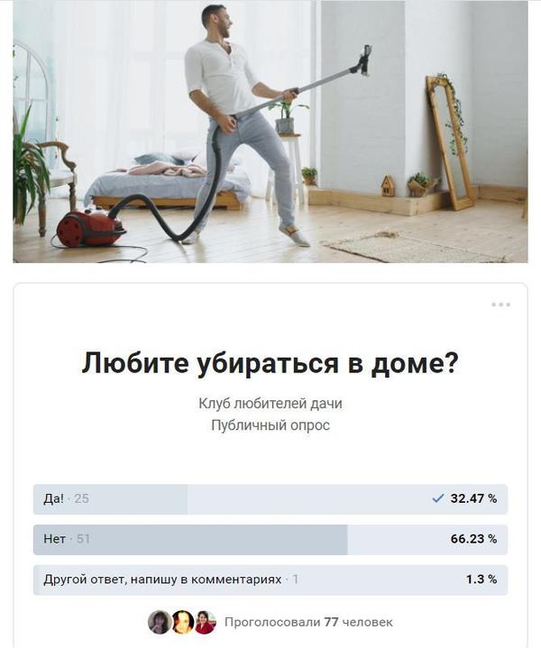 Однако… большинство людей уборку не любят))) Даже точнее — по сравнению с любителями уборки вдвое больше людей, которые это дело не считают любимым)))