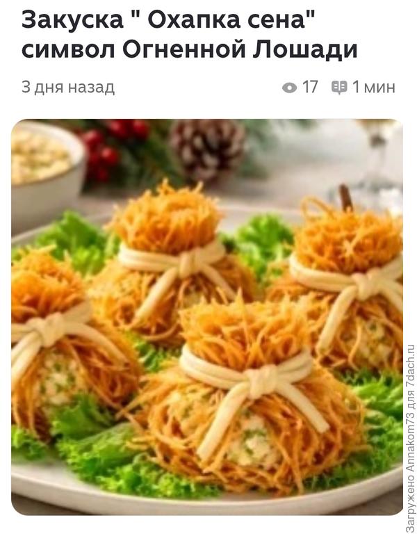 Закуска «Охапки сена» подойдёт для новогоднего стола 2026 и понравится новогодней Лошади.) Она проста в приготовлении, но выглядит эффектно и нарядно: под хрустящей «соломой» из золотистого картофеля скрывается сочная начинка из куриного филе, свежего огурца и нежного сыра. Лёгкая дымная нотка копчёного сулугуни придаёт вкусу выразительность и гармонично объединяет все ингредиенты.