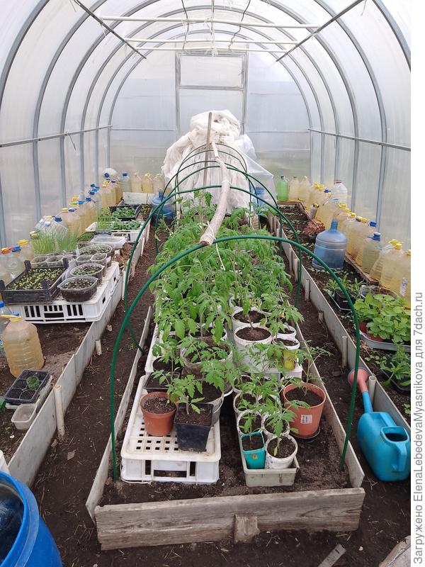 Рассада не помещается в доме, поэтому большую часть цветов, луки, базилик вынесла в теплицу. Стоят на двух пластмассовых столах. В холодные ночи прикрывала спанбондом. Потом вынесли в теплицу вентилятор типа Ветерка, периодически включала позапрошлой хоть не морозной, но холодной ночью.