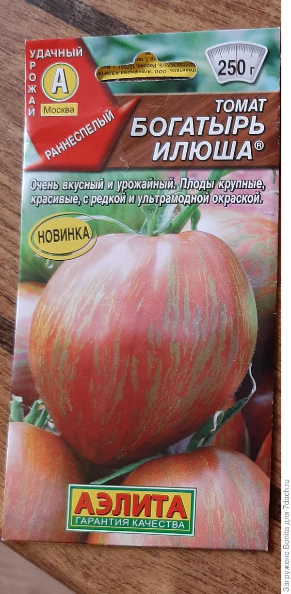 Томат назывался Богатырь Илюша от Аэлиты (оригинатор). Помимо обычных положительных характеристик, на пакете с семенами в описании сорта было написано, что сорт с «невероятно красивыми плодами». И картинка на пакете тоже соответствующая. Я конечно же соблазнилась на невероятно красивые плоды. 🙂