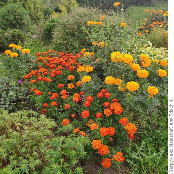 эти бархатцы были посажены над торфяной канавкой, полумесяцем выложенной вокруг маленькой сосенки: поразили в самое сердце — любуюсь, глаз не могу отвести. Кусты высокие, зелень пышная, сочная, цвет листвы насыщенный. Цветочки яркие тёмный бархат! ЧУДО- как хороши! Цветение продолжительное. А в прошлом году те же самые бархатцы- несколько кустиков мелких, процвели не более 2 недель… и усохли… Видимо, какие-то не такие условия я им создала: тогда сеяла в ОГ, а в это лето-рассадные…
