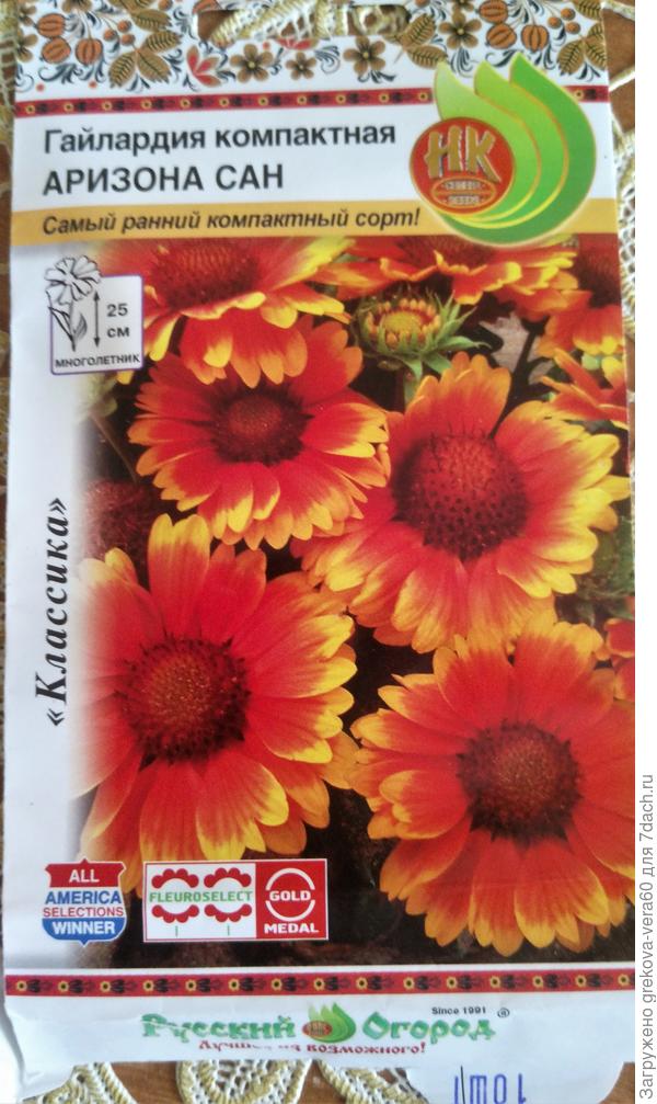 Семена этой Гайлардии Оризона Сан мне дала сестра, а теперь я приобрела семена нашей фирмы «Русский огород», хочу сравнить результат, полученный от импортных семян и от фирмы «Русский огород», мне показалось, что на картинке немного другая окраска цветов, но, может быть, я ошибаюсь.