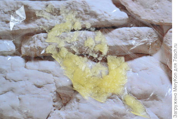 Кусочек пищевой пленки накладываем на терку и трем чеснок прямо по пленке.