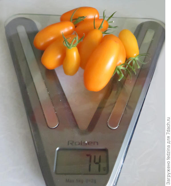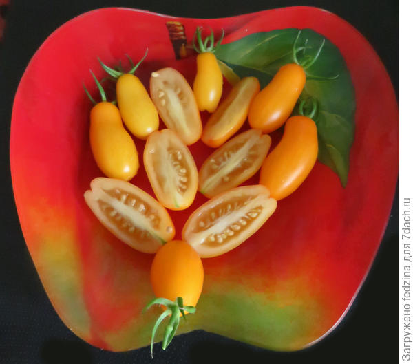Помидорки похожи на свечки желтого цвета длиной до 7 см. Мякоть у этого томата хрустящая, но мне сочности не хватило (я люблю, чтоб салатик плавал в томатном соке). Но, вынув семена, я мякоть сгрызла. (Вкусно и необычно было похрустеть томатом…) Всё-таки плоды лучше использовать для консервации, вялить или есть просто так, не в салате.
