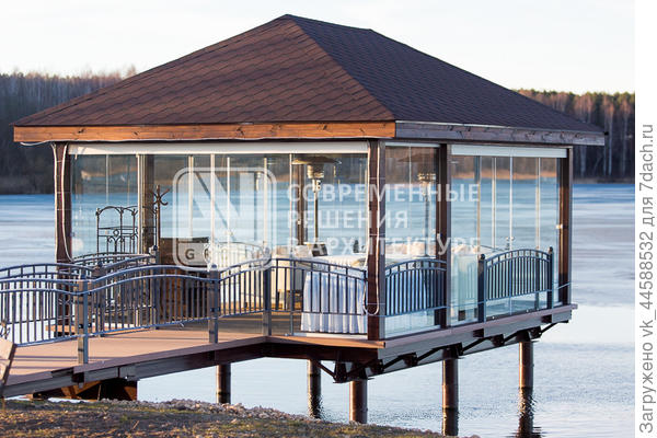 Присоединяюсь к советам построить типа пирса на сваях и на нем беседку. Сама беседка может быть металлическая, от сквозняков можно закрыть монолитным поликарбонатом, прозрачным (бесцветным) или цветным. При желании поликарбонат на зиму-весну можно снимать, чтобы потом не отмывать после паводка. Весной помыли керхером металлическую обрешетку, прикрутили поликарбонат. У нас тоже затопляемая зона, топит правда не каждый год, беседка была типа такой, как на первом фото. Фото не мое, из интернета. Наша беседка не пережила последнего наводнения, над ней проплывал сарай и снес ей крышу. Лиственница неплохо конечно, но дороговато выйдет и на сваях будет смотреться громоздко. И бревна во время наводнения будут напитываться влагой и том от сыростью будет отдавать.