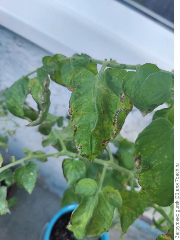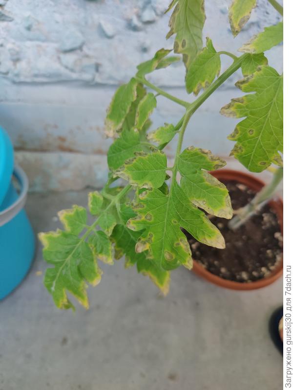 Судя по габитусу томата можно сказать, что 10 литров ведра корням мало, возможно, что и корни подгорели.