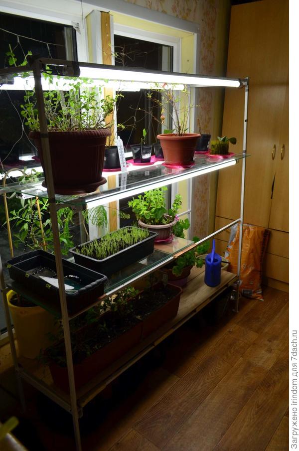Для двух полок нашлось стекло, для одной — ламинат. Вариант для рассады: