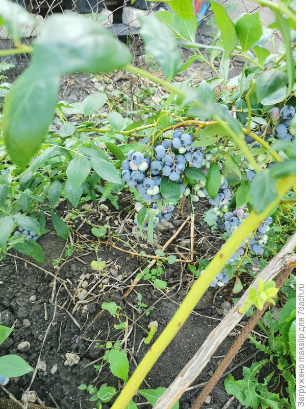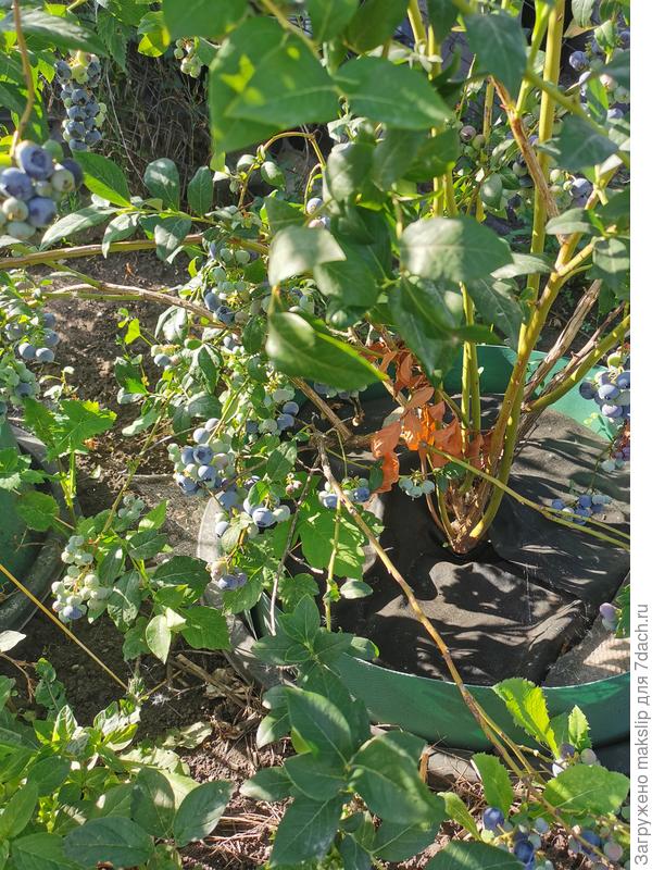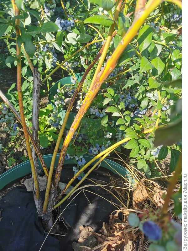 Нет, я её весной пересадила на ПМЖ, сделала ямы, диаметр 50 — 60 см, глубина то же около 50 см, стенки и дни проложила геотекстилем (не путать с укрывными: лутрасилом и спанбондом), это материал для ландшафтных работ, он более прочный, на дне оставила небольшое отверстие. Грунт готовила в емкости, на дно насыпала керамзита, помимо кислого торфа использовала песок, хвойный отпад, опилки, сверху засыпала корой, а сверху положила ещё круг из кокосового волокна, но оно за 4 года уже рассыпалось. Изредка для подкисления использую серу, а так просто 2 раза за сезон подкармливаю специальным удобрением для голубики фирмы Forte. На зиму ветки связываю, поэтому первые два года на зиму одевала на кустики 5-литровые обрезанные с 2-х сторон канистры. Иначе снежный наст может переломать тонкие ветки. Геотекстиль (край) виден на фото.