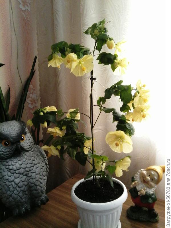 Абутилончик мой подрастал, образуя новые побеги и бутоны. Надо отметить, растёт этот цветок довольно быстро. Мой малыш за лето добрал к своему первоначальному росту ещё, наверное, сантиметров сорок. Возникла необходимость пересадки его в более просторный горшок и установки опоры. В августе пришлось укоротить немного его верхушку и частично — боковые побеги. Несмотря на все манипуляции, абутилон продолжал цветение.