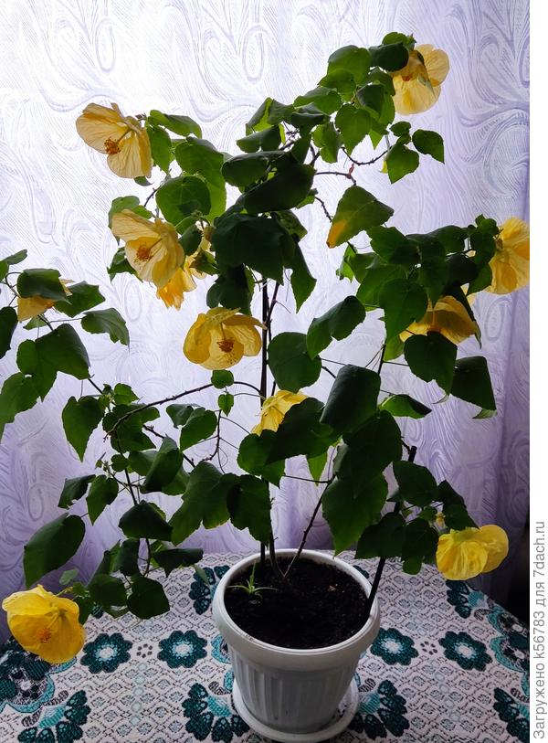 Спустя два месяца подросшая кроха набрала бутоны, которые висели, как фонарики. Когда они раскрылись, я просто ахнула! На невысоком растении красовались желтые цветы около шести сантиметров в диаметре. Я увидела впервые, как цветёт абутилон.