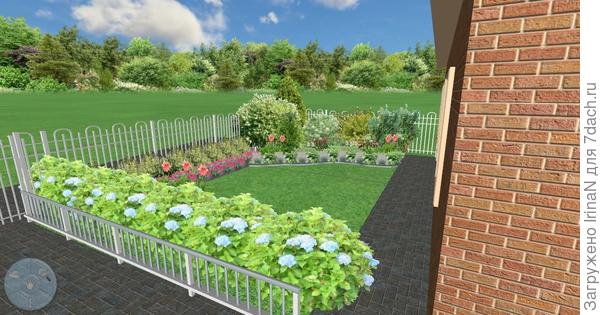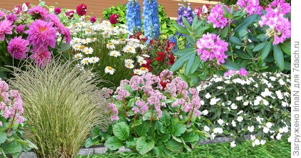 Кстати, по поводу переднего фона, а если низкорослыми хризантемами окантовать край цветника? Их же можно из семян вырастить? А расцветок у них большой выбор. Я у себя изгородь из белой лапчатки буду внизу подбивать малиновыми хризантемами, мне нравится такой вариант.