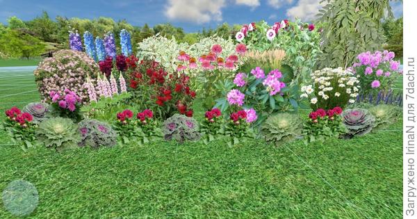 Всем здравствуйте! Татьяна, пейзажный стиль, а именно, стиль русской усадьбы, предполагает наличие пышной зелени, где основными «солистами» выступают «естественные» растения и близкие к ним виды и сорта, то есть минимум экзотики, кричащих красок, крупных цветков, ярких пестрых листьев. Лилии, георгины, амарант, колеус буду уместны, скорее всего, в деревенском цветнике, но не в природном (за исключением разве что лилии кудреватой). Пейзажный стиль считается малоуходным и предполагает наполнение цветника многолетними растениями. Однолетние цветы могут использоваться в течение нескольких сезонов, пока Вы подбираете (выращиваете) многолетние растения. Особая роль в природном цветнике отводится злакам, они способны создать и легкую дымку (молиния, щучка, споробол), и сочный фон (плоскоколосник широколистный), и осенний акцент (просо прутьевидное, сеслерия осенняя). Обратите внимание, что злаки бывают теплорастущими (или теплосезонными, отрастающими позже) и холоднорастущими (или холодносезонными, отрастающими рано весной). Исходя из Ваших условий, лучше избегать посадки вейника, фаляриса, райграса – в знойные дни они утрачивают декоративность (временно, но ощутимо). Цветовое решение – розово-голубое с элементами фиолетового и белым – на мой взгляд, выбрано верно. Плотность посадки определяем исходя из конечных размеров растений и учитываем, что пик декоративности цветника наступает через 2-3 года после создания. При этом первые годы цветник будет казаться «редким», в этом случае на помощь приходят летники, довольно быстро создающие объем и цвет. Для придания композиции естественного и цельного облика, пользуемся приемами ритма (повторения пятна одного и того же цвета, формы и фактуры (то есть образованного одним и тем же видом и сортом растения), что особенно актуально для растений, быстро теряющих декоративность – это не обязательно луковичные, еще и дельфиниум, дицентра, дороникум и пр.) и колеблющихся контуров (посадка среднерослого растения на передний план, высокорослого на средний). Насколько я поняла по рисунку, композиция на этом месте будет обозреваться со всех сторон, почему бы не создать цветник кругового обзора, разместив самые высокие в центре, а затем постепенно уменьшать высоту к периферии? Тем более, что ширина (3 м) позволяет. В этом случае, возможно, придется уйти от очень высоких растений, подобрав последних таким образом, чтобы высоты ярусов примерно соответствовали ряду чисел Фибоначи (об этом и многом другом Вы можете прочитать в книге И.Ю.Бочковой «Создаем красивый цветник»).