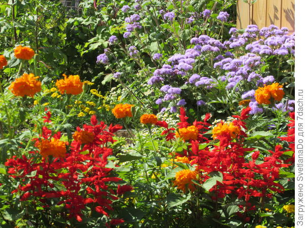 У меня есть сочетание, которое мне очень нравится! Бархатцы и сальвия! Ну, если хочется беленького и пушистого добавить, то можно разбавить гипсофилой.