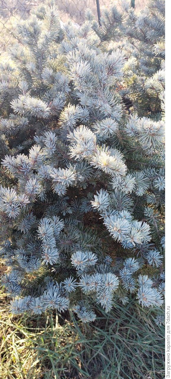 Очень красивый экземпляр ели колючей 'Glauca' (Picea pungens 'Glauca'), семейство Сосновые (Pinaceae). Она очень устойчива в городских условиях Севастополя, а вот на Южном берегу Крыма страдает от сухости воздуха и в зеленых насаждениях часто бывает однобокой.