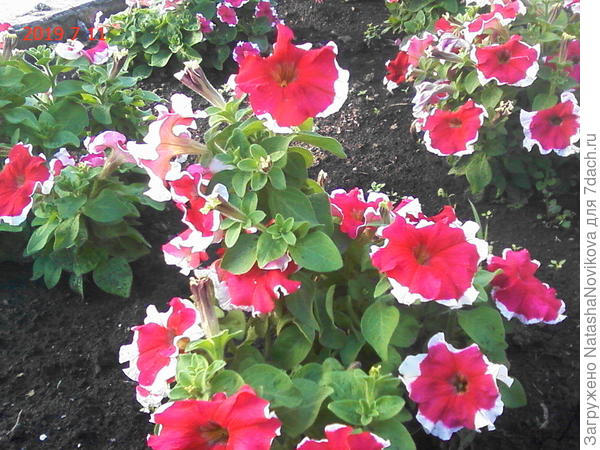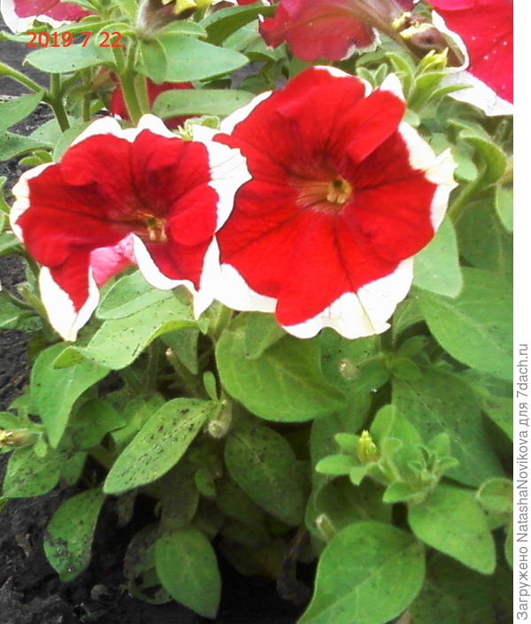 Кустики росли компактными и разветвлёнными, их густо покрывали бутоны, а затем и нарядные красные цветки диаметром 5 см, а яркий белый ободок по краю придавал контрастности.