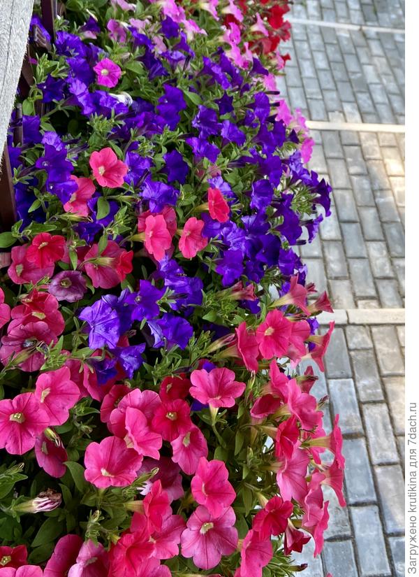 Здесь сочетание тёмной (бургунди) петунии и чуть более светлой с белой каймой и алиссума