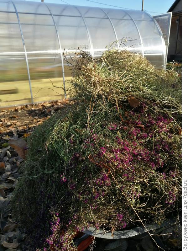 Следующим слоем я решила уложить алиссум, этого добра у меня было очень много. Его огромные шапки шикарно цвели в этом году, ну а теперь послужат питанием для моего будущего огорода. Также в ход пошли растительные остатки бархатцев. Равномерно разложив их по всем грядкам, приступила к третьему слою.