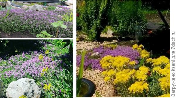Ксения, тимьян хорош по краю цветника, который не граничит с газоном. Иначе он будет наползать на газон и через него неизбежно начнет прорастать газонная трава. Тимьян лучше смотрится, когда граничит с мощением (как на фото у Юлии) или, например, с отсыпкой из щебня, и наползает на него.