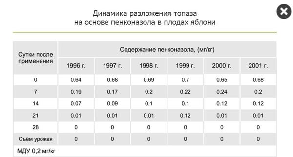 — на 14-й 0,07–0,12 мг/кг (ниже МДУ( максимально допустимого уровня) в 2,8–1,6 раза для плодовых семечковых).