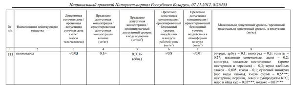 А теперь смотрим на белорусский документ «Гигиенические нормативы содержания действующих веществ пестицидов (средств защиты растений) в объектах окружающей среды, продовольственном сырье, пищевых продуктах»