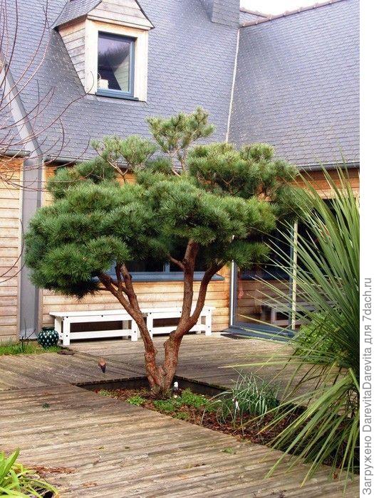 Направление формировки хвойных в японском стиле — ниваки. Это бонсай, но в открытом грунте. Cтвол декоративно изгибают, рост ограничивают убирая ежегодные приросты прищипкой, как писал Барон. Фот не мое, у родственников растут подобные сосны на участке, чтобы не создавать лишнюю тень. Еще хорошо формируется манчжурский орех регулярной обрезкой, можно создать микро-орех.