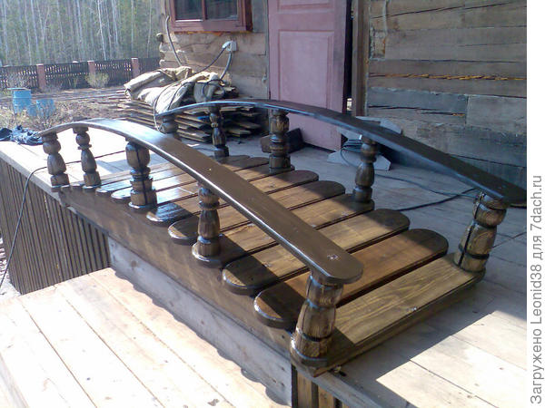 Основание делал из доски толщиной 50 мм и шириной 150. Обстругал, нарисовал изгиб и выпилил лобзиком. Концы основания сделал из этой же доски, на фото не очень понятна их конструкция, но если кому-то понадобится, то сфотографирую отдельно. По этому же принципу сделал и мостик для внучки.