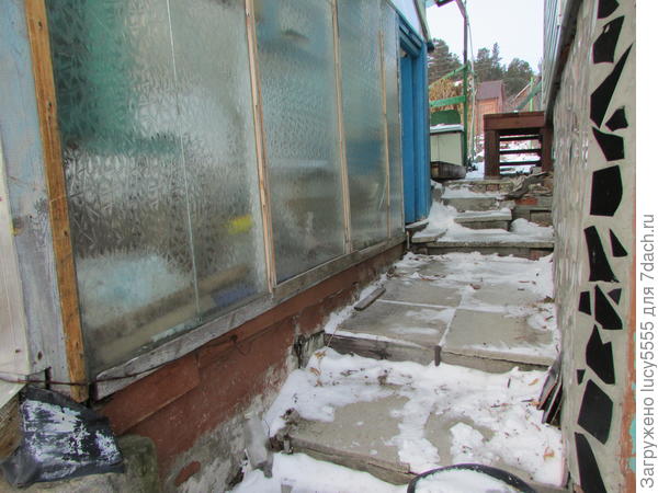 Так вот, мой вопрос касается этой части, которая напротив кафельной. Как её немного укрепить и облагородить. Если смотреть на нижнее фото, то у меня всё-таки просится кафель, он будет внизу, гораздо ниже того, что у дома, и «коридора» быть не должно. Но дело в том, что я хочу прикрыть стёкла сантиметров на 50, он с трещинами, как бы не выдавило. Вот надо их прикрыть и потом снаружи я и займусь украшательством. Один вариант — закрыть полностью основание и 50 см стекла. Второй — только основание и сделать на высоте 50 см дополнительную доску, и уж её украшать.