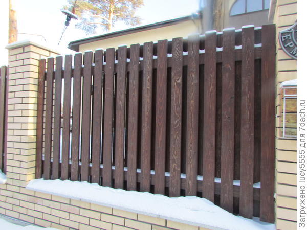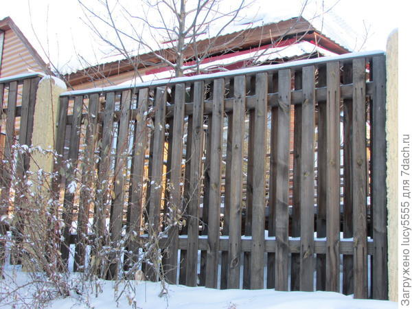 А у нас дача возле баз отдыха, и отдыхающие бывают разные… Но поскольку это сосновый лес, и не хотелось себя от него отгораживать, то выбрали такой вариант (правда до снега не успела докрасить, вертикальные стойки будут белыми). Благодаря расстоянию между досками (3-4 см) он не смотрится тяжелым. Но очень привлекает любопытных прохожих… Но согласна с теми, кто не воспринимает высоченный профнастил, поэтому буду высаживать вдоль забора что-нибудь, что закроет участок от оччееень… любопытных прохожих.