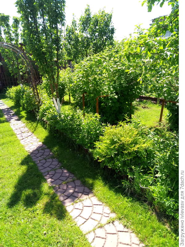 Сзади за яблоней растет густой куст чубушника, а справа от неё вдоль дорожки обычный садовый шиповник.