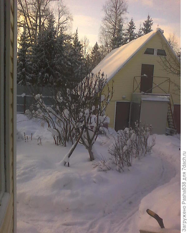 На фото желтый — это гараж, он на две машины и отапливаемый. А раньше примерно на его месте, только чуть дальше от дороги стояла баня, ну то есть мы её так называли, хотя ни разу в жизни в ней не парились — эдакая наспех сложенная из сырого, росшего на участке леса избушка, в которой мы года три или четыре жили, причем тогда в поселке даже электричества не было ))) Ну а потом она торжественно сгорела, и сожгла заодно и эту яблоньку, пенек был ну от силы сантиметров десять-пятнадцать над уровнем прививки. Но она вот обратно отросла. Не то, чтобы прям уж огромные урожаи, но яблочки вкусные, поэтому я её не убираю. Хочу при случае купить колоновидных яблонь, но сажать буду в другом месте участка.