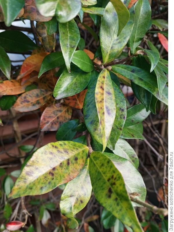 Вот так выглядят листья, которые опадают. На одном есть черные точки – механические повреждения, не пятнистость. От стяжек пятнышки потемнели