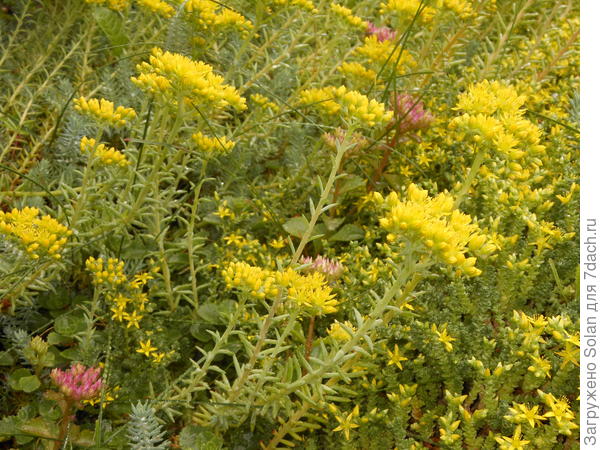 Это — очиток отогнутый. У Вас подобралась коллекция для рокария))). Солнцелюбив, хотя, по моему личному опыту у себя в саду — выживет, где угодно))). Но на солце стремительно разрастается и очень обильно цветет, выпуская высокие цветоносы с солнечной гроздью цветов. Размножается, буквально, от любого кусочка