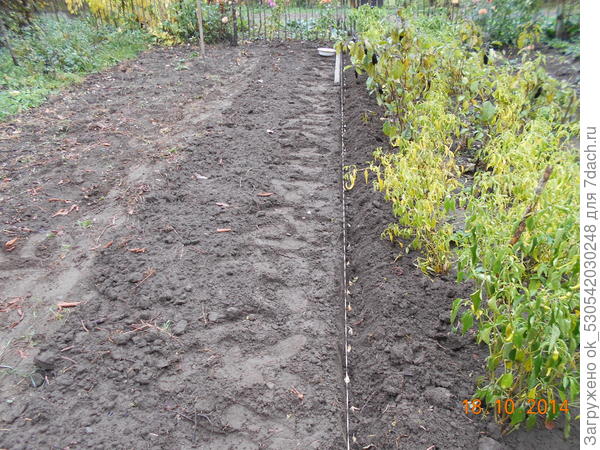 Я сажаю чеснок редко, больше питания корням растений и удобство ухода за ним. Сажаю лентами, в ленте два рядка с расстоянием между ними 25 см, расстояние между лентами 40 см. Расстояние между растениями в рядке 15 см. Всего получается у меня 4 ряда, примерно 250 растений, что на нашу семью достаточно и на еду, и на последующую посадку. Высаживал чеснок 18 октября. Рано высаженный чеснок прорастает, а поздно высаженный — подмерзает. Озимый чеснок высаживают, обычно, за 25 -35 дней до похолодания. В течение этих дней высаженные зубки должны укорениться и образовать хорошую корневую систему, но при этом из зубков не должны прорасти листья. Грядка у меня длиной 9 метров. По шнуру отбиваю линию и копаю канавку глубиной 6 -7 см, затем в неё по маркеру ставлю зубчики чеснока, донцем вниз.