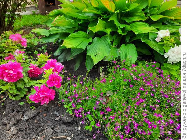 Лет десять назад купила в цветочном магазине три растюшки с незнакомым названием — «хоста». Весна еще только начиналась, а растюшки ожили в пакетах. Пришлось высадить их в цветочные кашпо, поставить на окно и ждать, что получится. Получились красивые кустики с необыкновенными листочками — крупными, сочными, яркими. Как только земля оттаяла, высадила их в грунт на клумбу, которую решила разбить у входа на территорию участка. Добавила лилий, кустик спиреи японской, а в начале лета высадила петуньи. Так, одновременно, началось увлечение хостами и миксбордерами. Остановиться не могу до настоящего времени! Каждый год разбивала по клумбе, переустраивала их, и на каждой высаживала хосты.