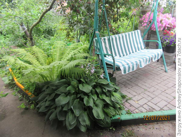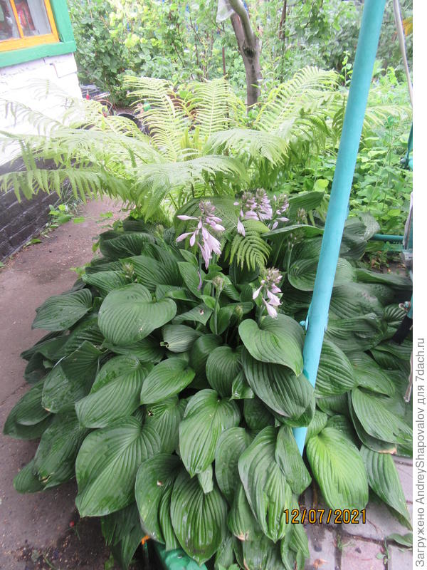 Прошло время и хосты разрослись, стали хозяйками на клумбе. Особенно хороша обычная подорожниковая хоста. Высота куста около 50-60 см, а в диаметре до 100 см.