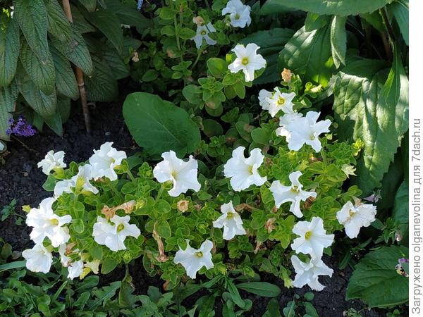 Я разместила Комплиментунию белая F1 на одной клумбе с петуниями из серии Императорская семья Ольга F1 и Анастасия F1.