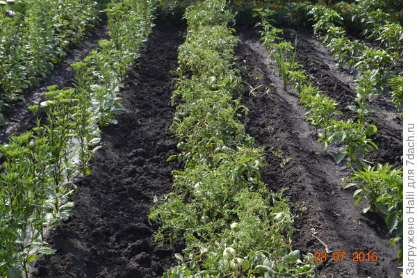 А это фото — те же помидоры, что выше фото. Пока рассада маленькая, поливаю в бороздку до завязи. Как появляются плоды, прекращаю полив.