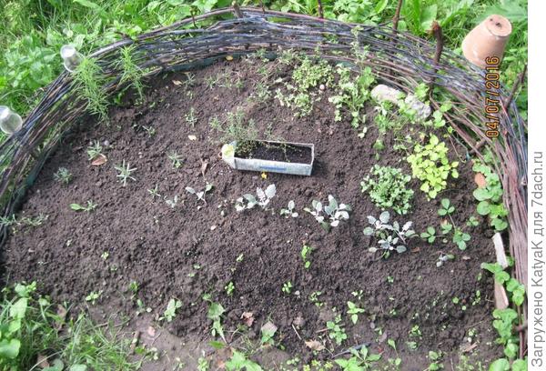 Даже грядку круглую сделала… и посадила клубнику))) и мне так понравилась клубника в круглых грядках, что сделала еще четыре)) А пряности все рассадила на свободные места.