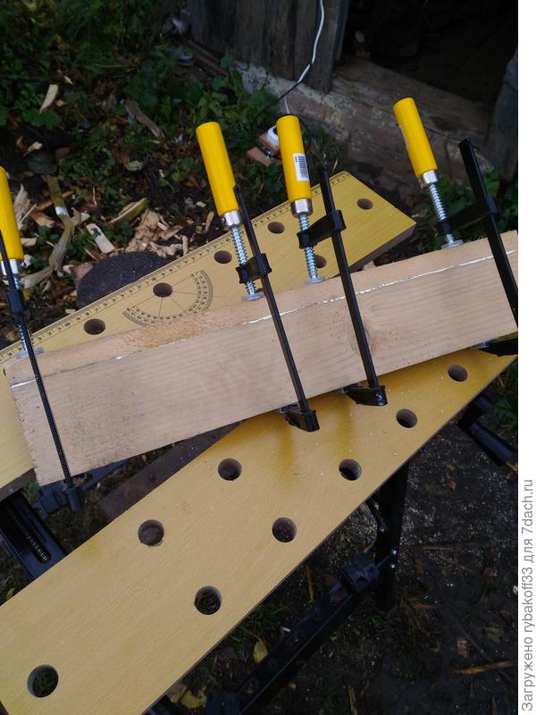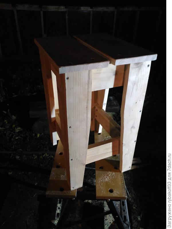 Предварительно доски отшлифовал при помощи дрели с насадкой. Ручной пилой произвел необходимые распилы. Сборку ножек производил при помощи столярного клея и саморезов.