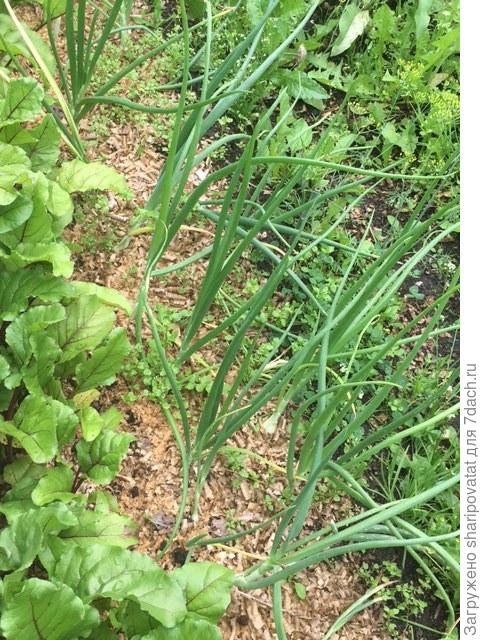 Среднеспелый белый лук 'Неман' («Гавриш») еще на грядке, зеленый, пока не собирается укладываться на хранение.