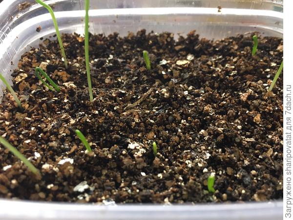 Сеяла сухими, промытыми в горячей воде семенами. 14 марта, на исходе второй недели второй волны посева лука (2.03.23), начинает всходить только порей 'Коламбус'.