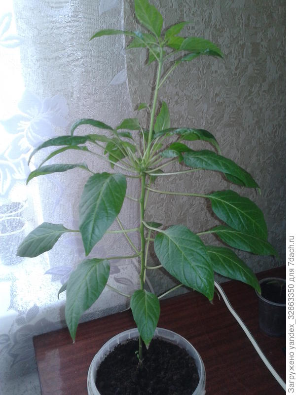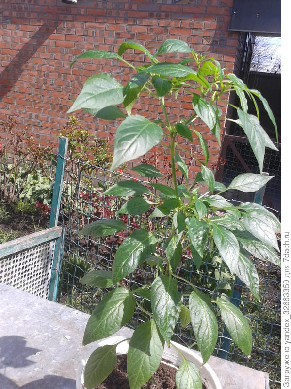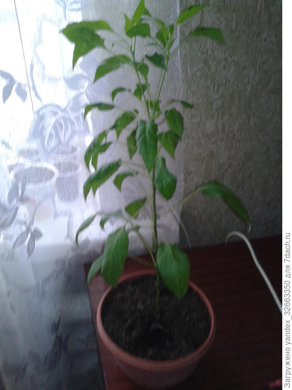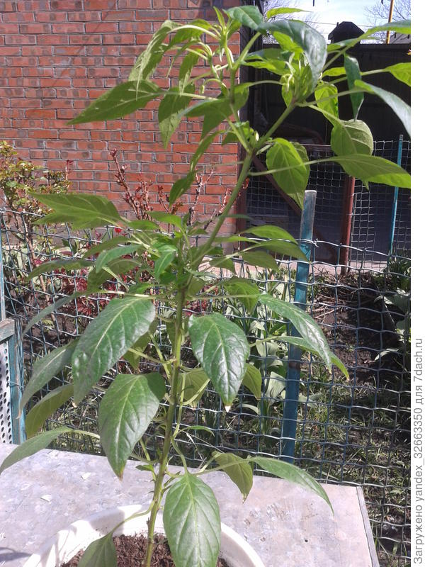 А теперь расскажу подробнее. 'Оконно-балконный' перец растёт необычно. Сначала один ствол, на нем два отростка, на них ещё два отростка и т. д. На каждом отростке метелка, да, именно метелка, как у укропа… Получается пушистый кустик.