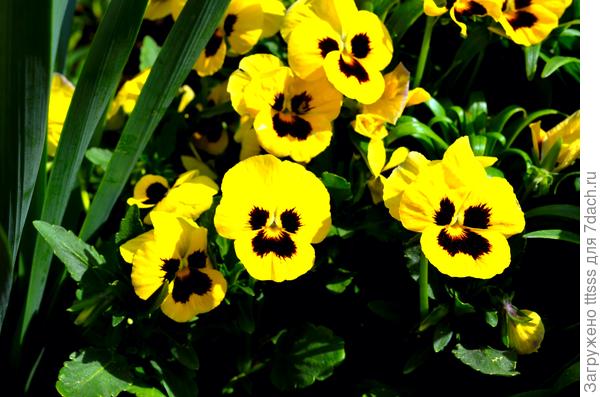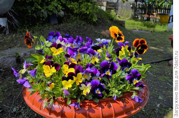 Виола декоративна всё лето. С анютиными глазками очень хорошо организовать кругооборот в виде непрерывного цветения. Здесь я применяю способ посева семян в разные сроки. На смену отцветшим растениям приходит подрастающий молодняк. В моём саду виола цветёт всё лето. Ранней весной, лишь только сойдёт снег, оставленные с осени кустики виолы сразу начинают цвести, а рядом с ними всходит молодая крепкая зелёная рассада, выросшая из обсеменившихся осенью цветов.Через пару недель эту подросшую мелочь я рассаживаю в вазоны и в цветочные грядки. Рассады виолы бывает настолько много, что хватает не только мне, но и всем друзьям и соседям. Я лишь изредка подсеиваю свежие сорта этого прекрасного цветка.