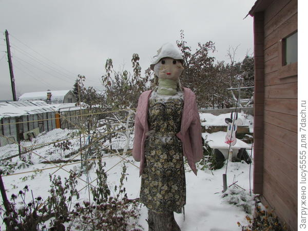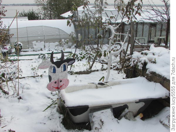 У меня сад на террасках длина 50м, уклон 4 или 5, поэтому в 4 местах это все расположено, чтобы не таскать все это в одно место. Все бочки разрисованы, шины вокруг засажены цветами, чтобы не портили вид. Большой короб спрятан за коровой (справа), это место за банькой.