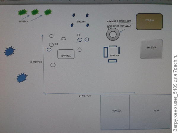 Лариса, по дизайну я советчик аховый и без фантазии, тут профи нужен))) Мне кажется, нужны газон и дорожка от дома к беседке, клумбу можно сделать произвольной формы что-нибудь вроде рокария, а растения рассадить около строений… Но этот набросок без учёта особенностей растений, а по идее нужно учитывать солнце-тень-влажность. Кольцо от колодца, наверно, придется как-то декорировать или садить в него ампельные цветочки. набросок