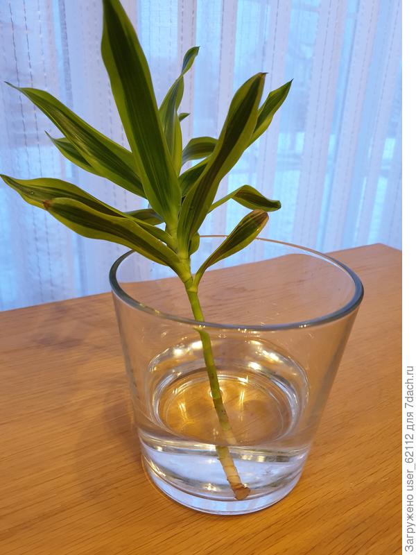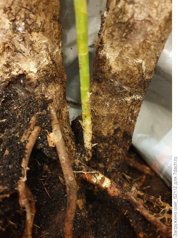 Когда вытащила я драцену с корневой системой то обнаружила, что росток без собственных корней (фото прилагаю). Росток я срезала, весь промыла (там все еще живет мучнистый червец!) и поставила в водичку.