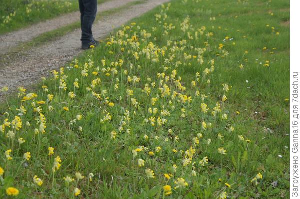 А на лужайке перед домом цветут первоцветы дикая примула.