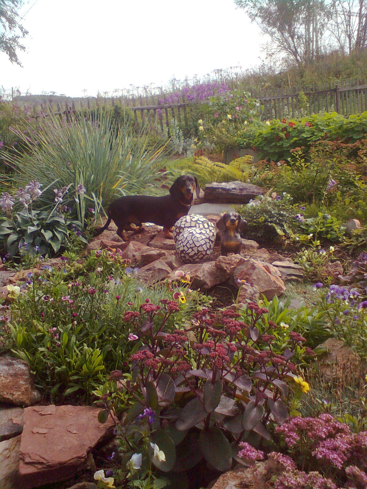 Подарили мне садовую фигурку таксы. Поставили ее среди камней в рокарии около маленького прудика, а наш такс Хантер в первый день долго не отходил от «нового друга», очень хотел с ним поиграть.