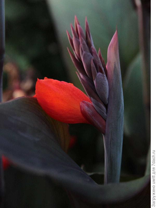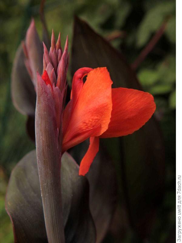Cannova Bronze Orange — потрясающей красоты растение, очень декоративное и нарядное. Я высаживала прошлым летом в кашпо на 25 л три саженца, и там они выросли с метр в высоту. Стебли прямостоящие и мощные, с огромными овально-продолговатыми листьями, заостренными на концах. Самый большой лист у меня был более 40 см в длину и 20 см в ширину, с темным, бронзовым оттенком по всей площади. Мне казалось, что и цвести растению не обязательно, декоративнее уже не будет.